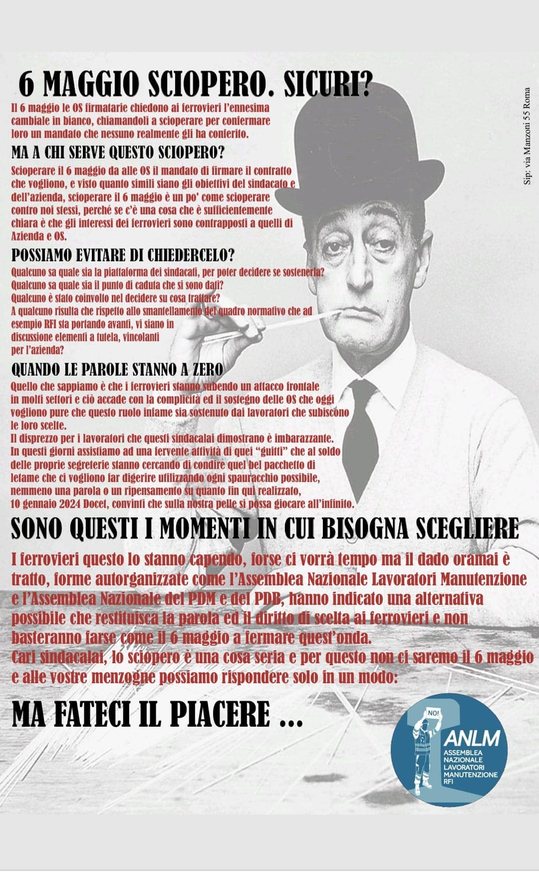 Cari sindacalai, lo sciopero è una cosa seria e per questo non ci saremo il 6 maggio e alle vostre menzogne possiamo rispondere solo in un modo: