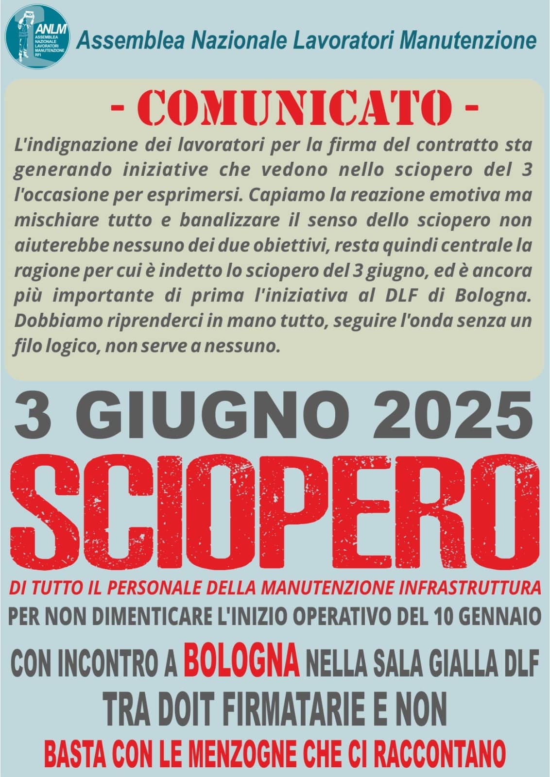 L’indignazione dei lavoratori per la firma del contratto sta generando iniziative che vedono nello sciopero del 3 l’occasione per esprimersi. Capiamo la reazione emotiva ma mischiare tutto e banalizzare il senso dello sciopero non aiuterebbe nessuno dei due obiettivi, resta quindi centrale la ragione per cui è indetto lo sciopero del 3 giugno, ed è ancora più importante di prima l’iniziativa al DLF di Bologna. Dobbiamo riprenderci in mano tutto, seguire l’onda senza un filo logico, non serve a nessuno.